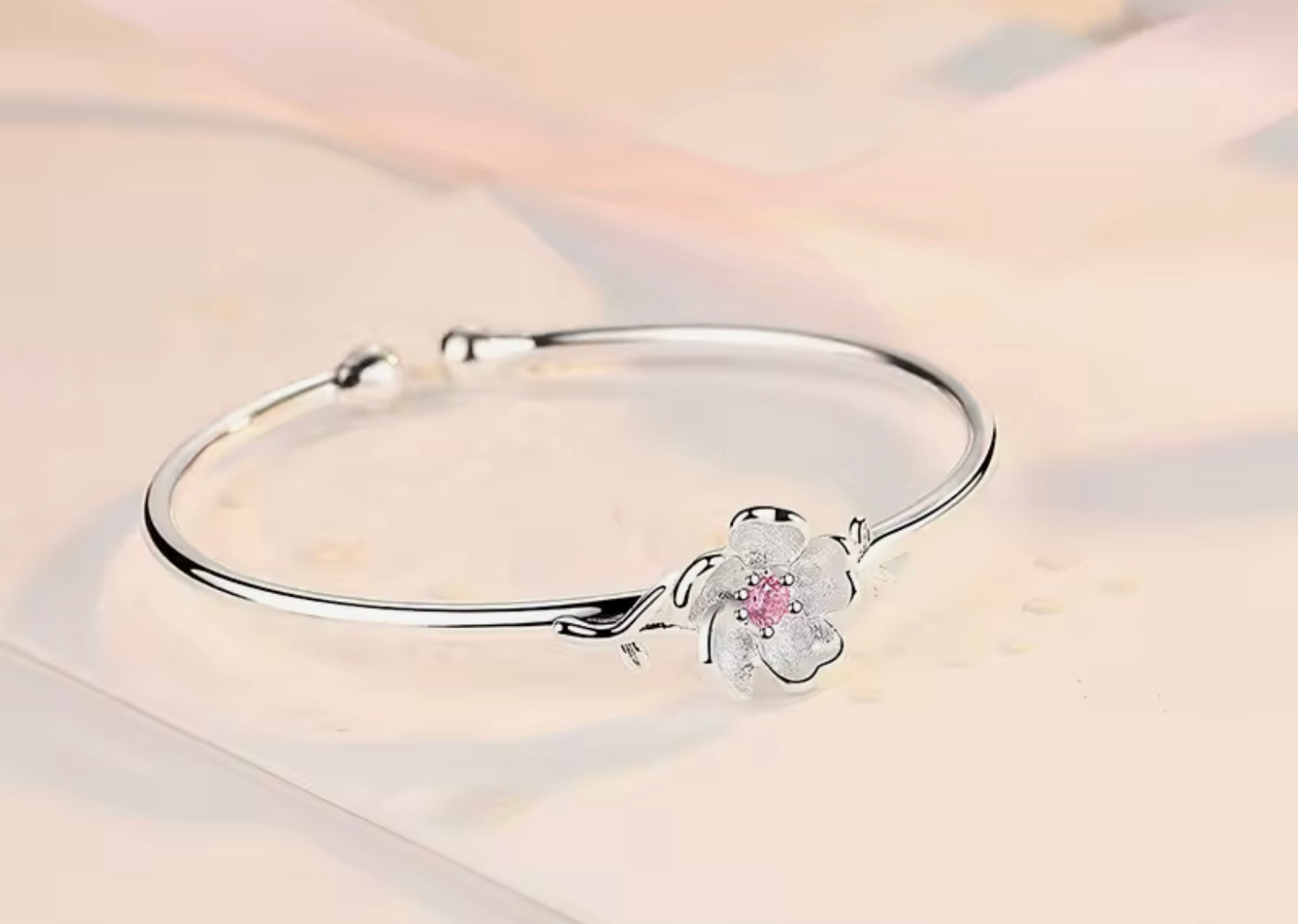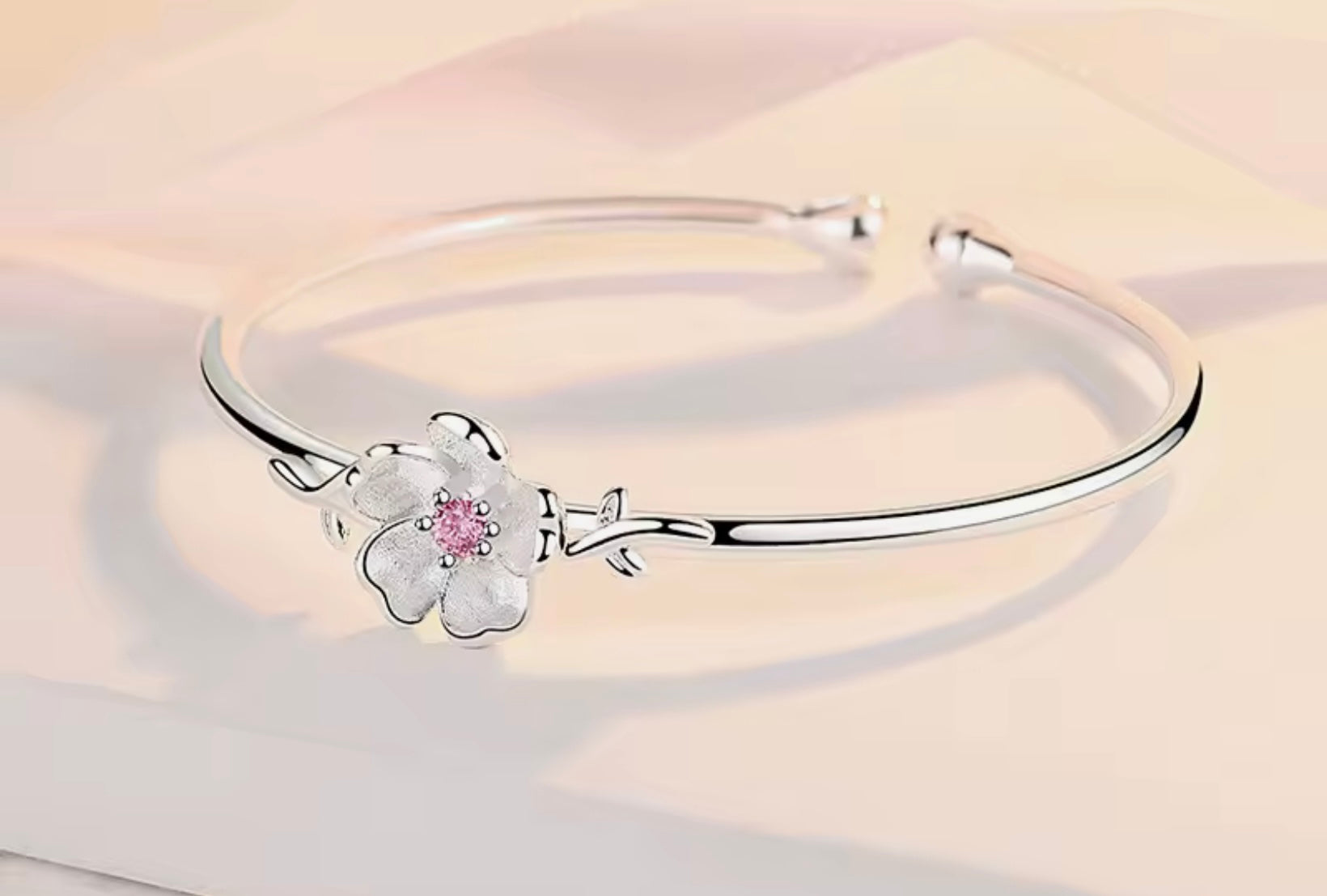 Crafted from high-quality 925 sterling silver, the Isla bangle features a delicate pink flower design that adds a subtle touch of elegance.