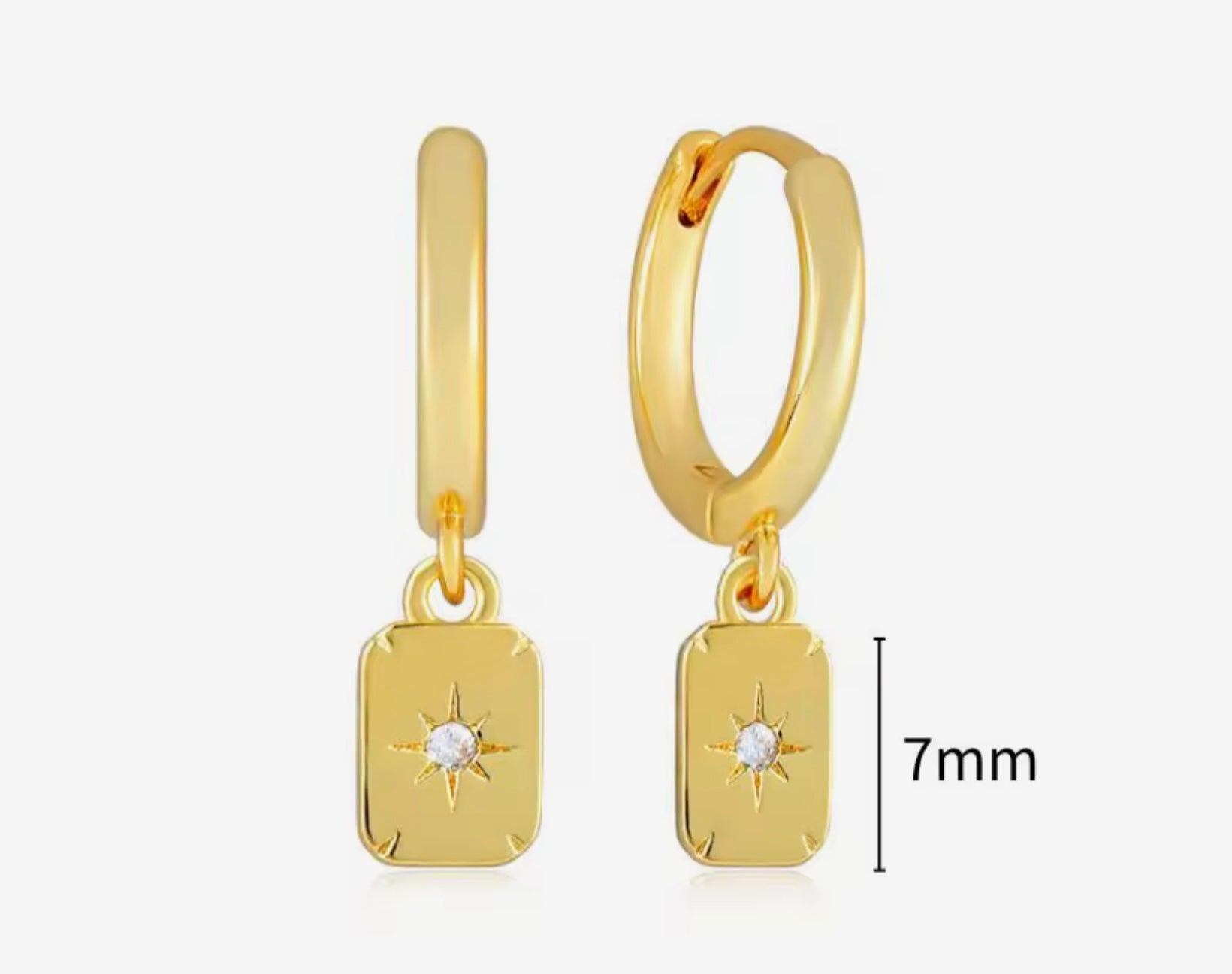 Crafted from 925 sterling silver with a luxurious gold finish, the Novie Huggies feature a distinctive star design on a sleek, rounded rectangular pendant.