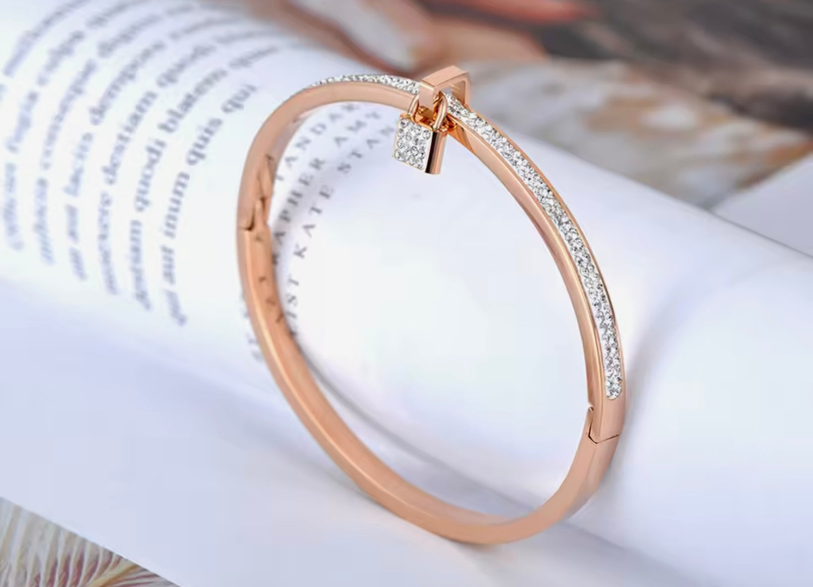 This rose gold stainless steel bangle combines durability with elegant design, featuring a secure padlock closure adorned with sparkling rhinestones.
