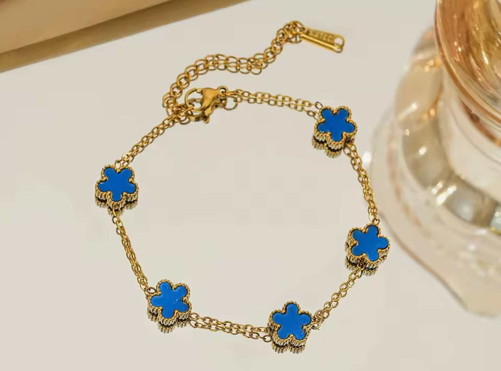 Crafted from durable stainless steel, the Fawn Bracelet features a delicate blue mini clover charm accented with elegant gold detailing.