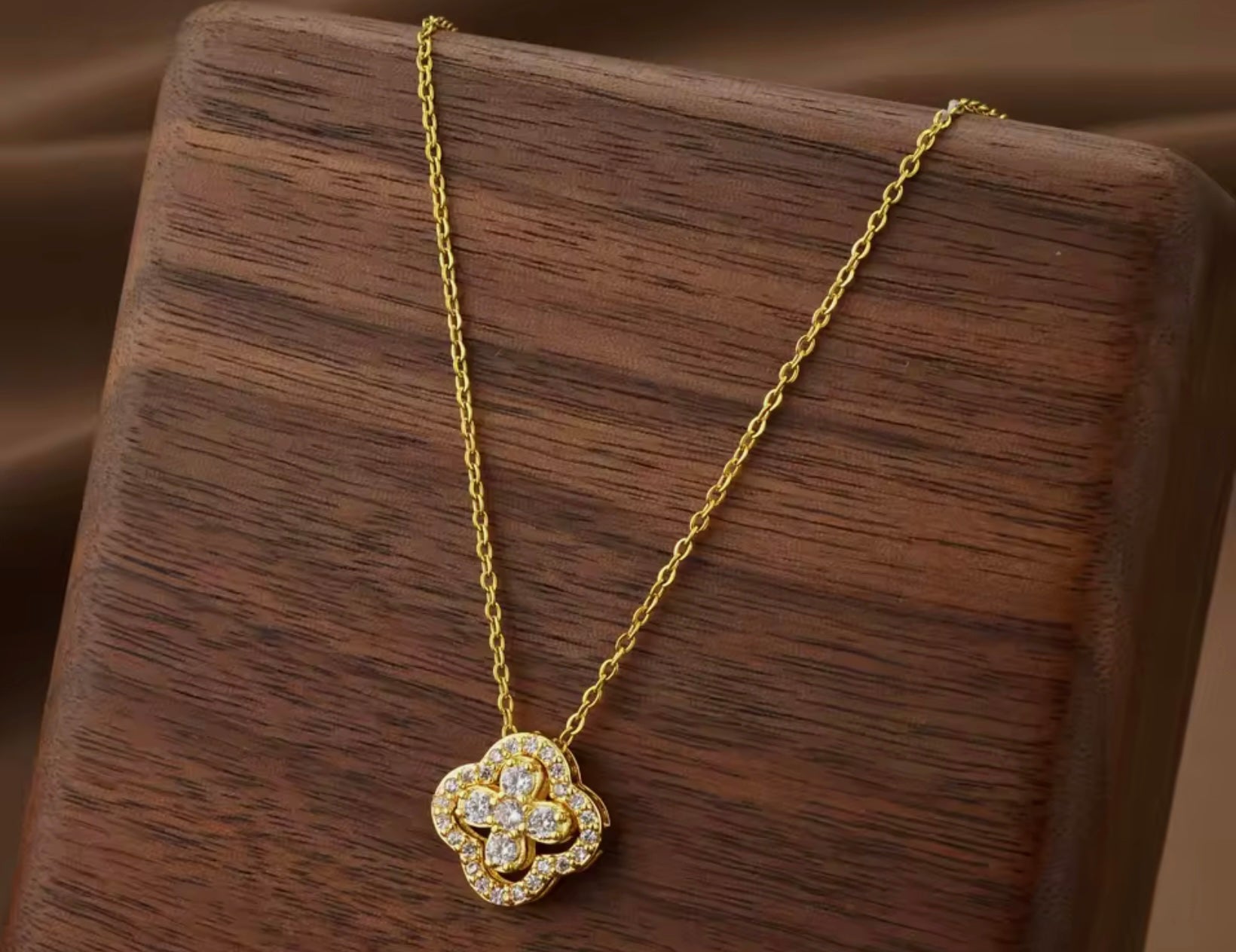 The Imani Necklace features a refined stainless steel clover pendant accented with sparkling rhinestones for subtle elegance.