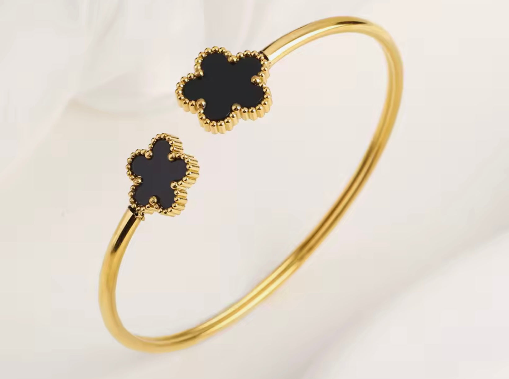 Its sleek black finish contrasts beautifully with the gold clover detail, creating a refined accessory that complements both casual and formal outfits.