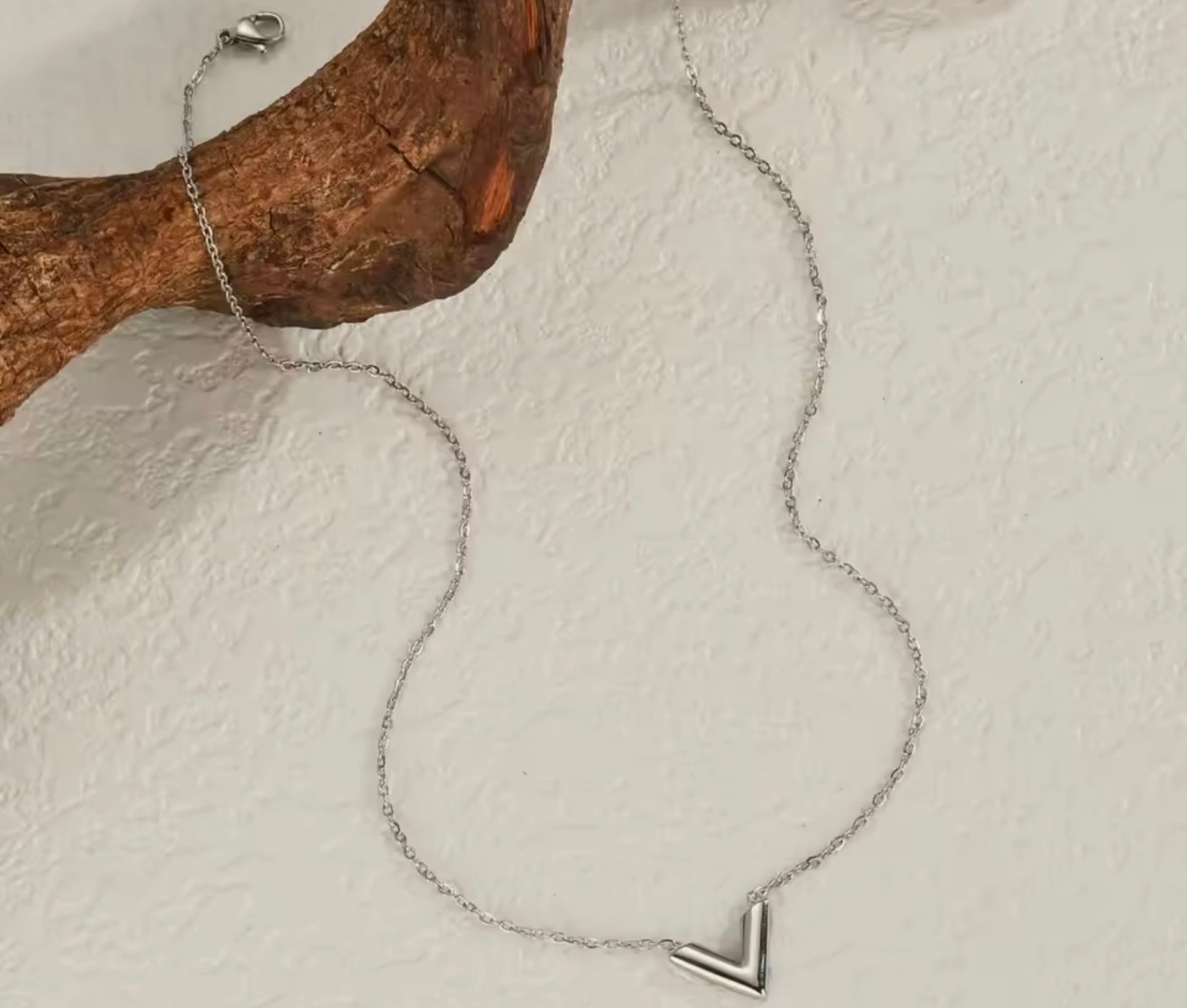 The Kaya Necklace is a beautifully crafted piece made from stainless steel, featuring an elegant silver ‘v’ pendant and adjustable links.