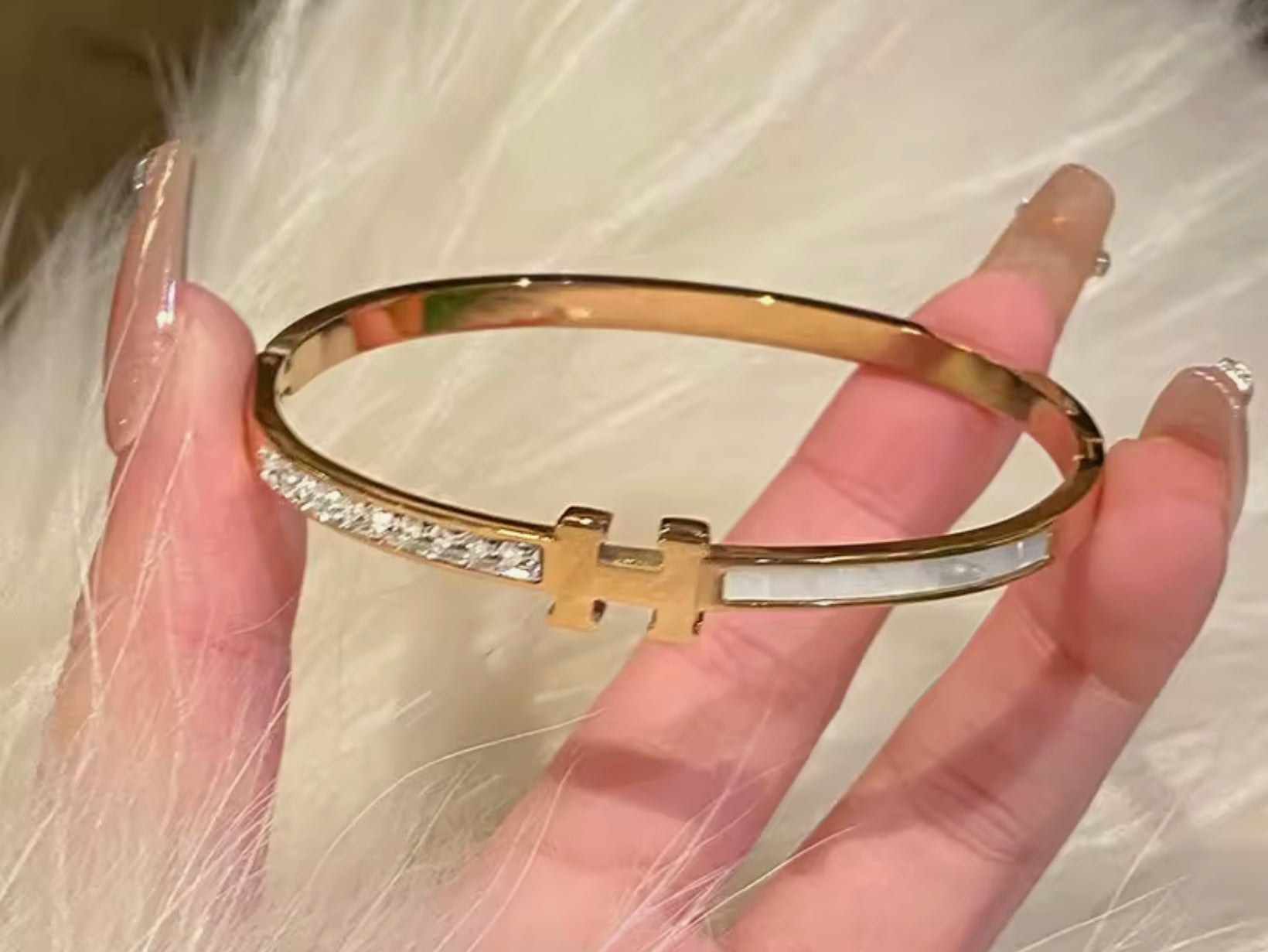 The Scarlett Bangle showcases a refined combination of durable stainless steel with a rose gold finish, accented by sparkling rhinestones and elegant white detailing.