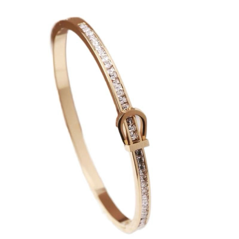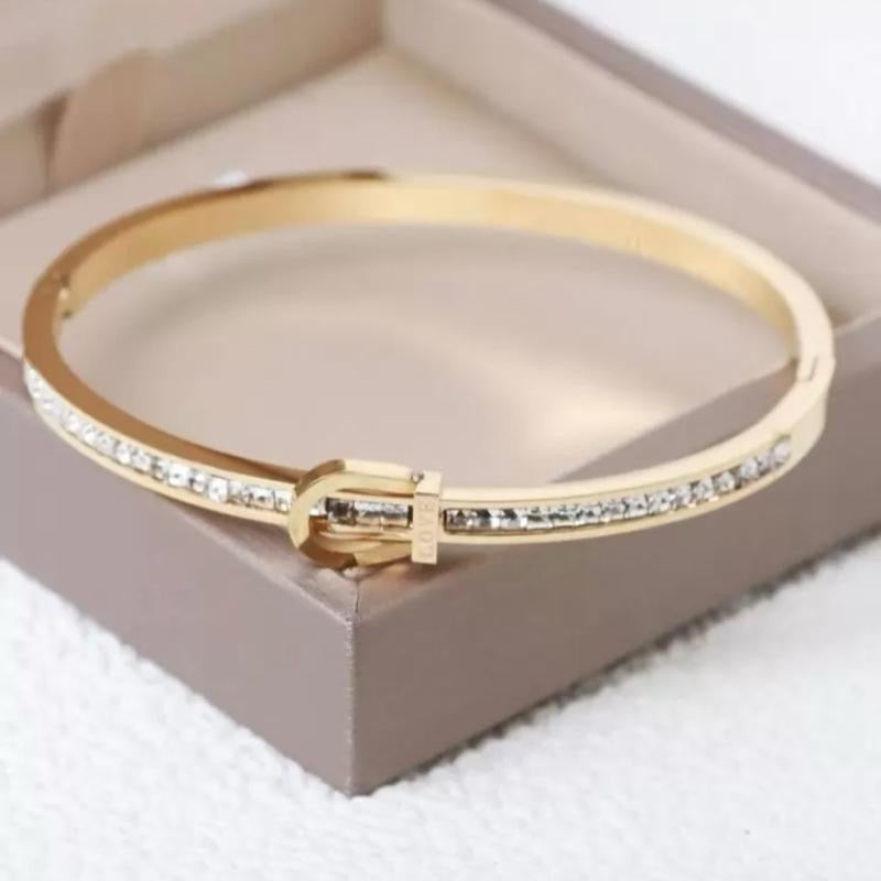 Crafted from durable stainless steel, the Gilda Bangle features a refined gold buckle design that combines strength with elegance.