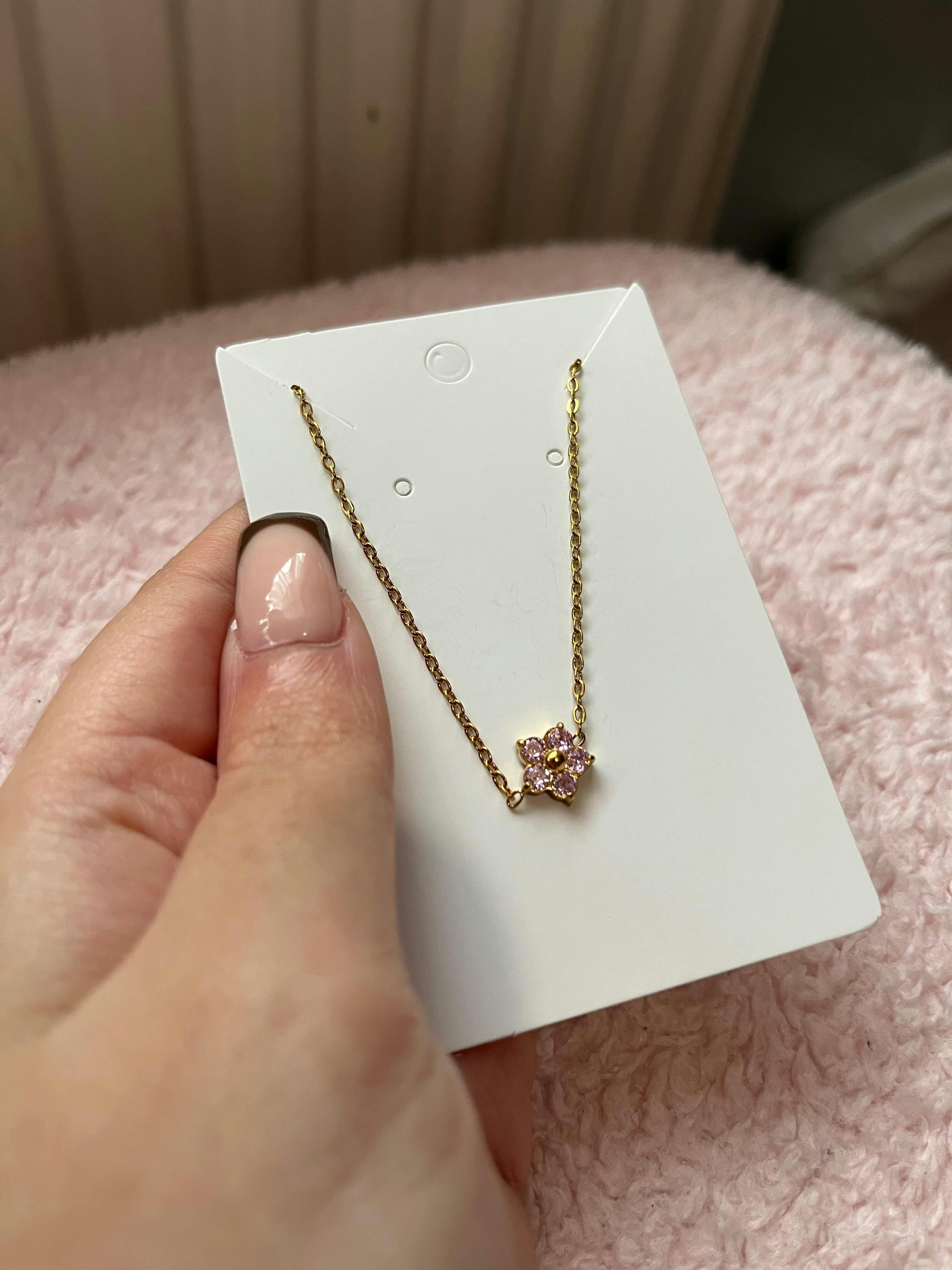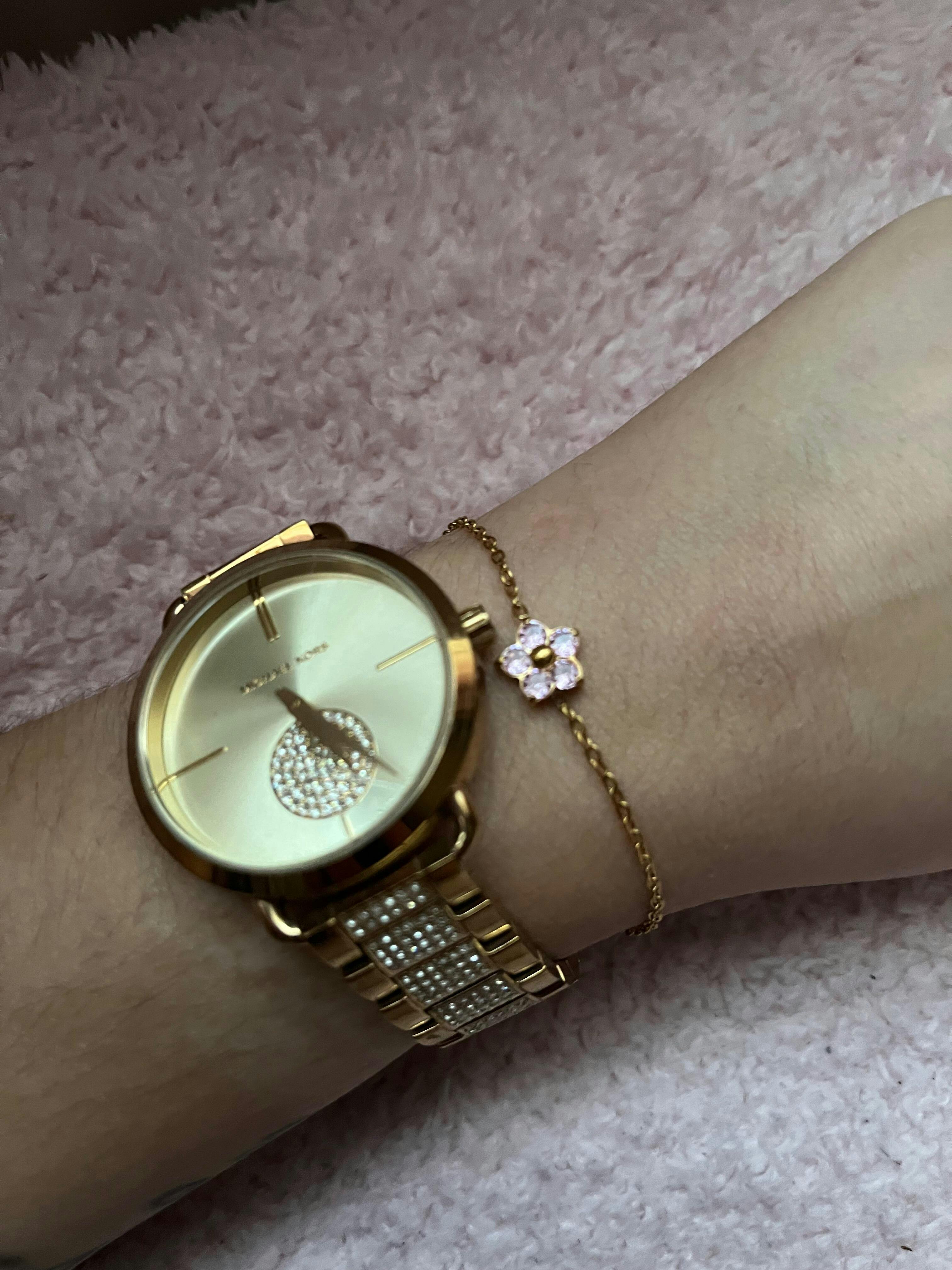 The Uma Bracelet combines durable stainless steel with a delicate pink flower design, finished in elegant gold tones.